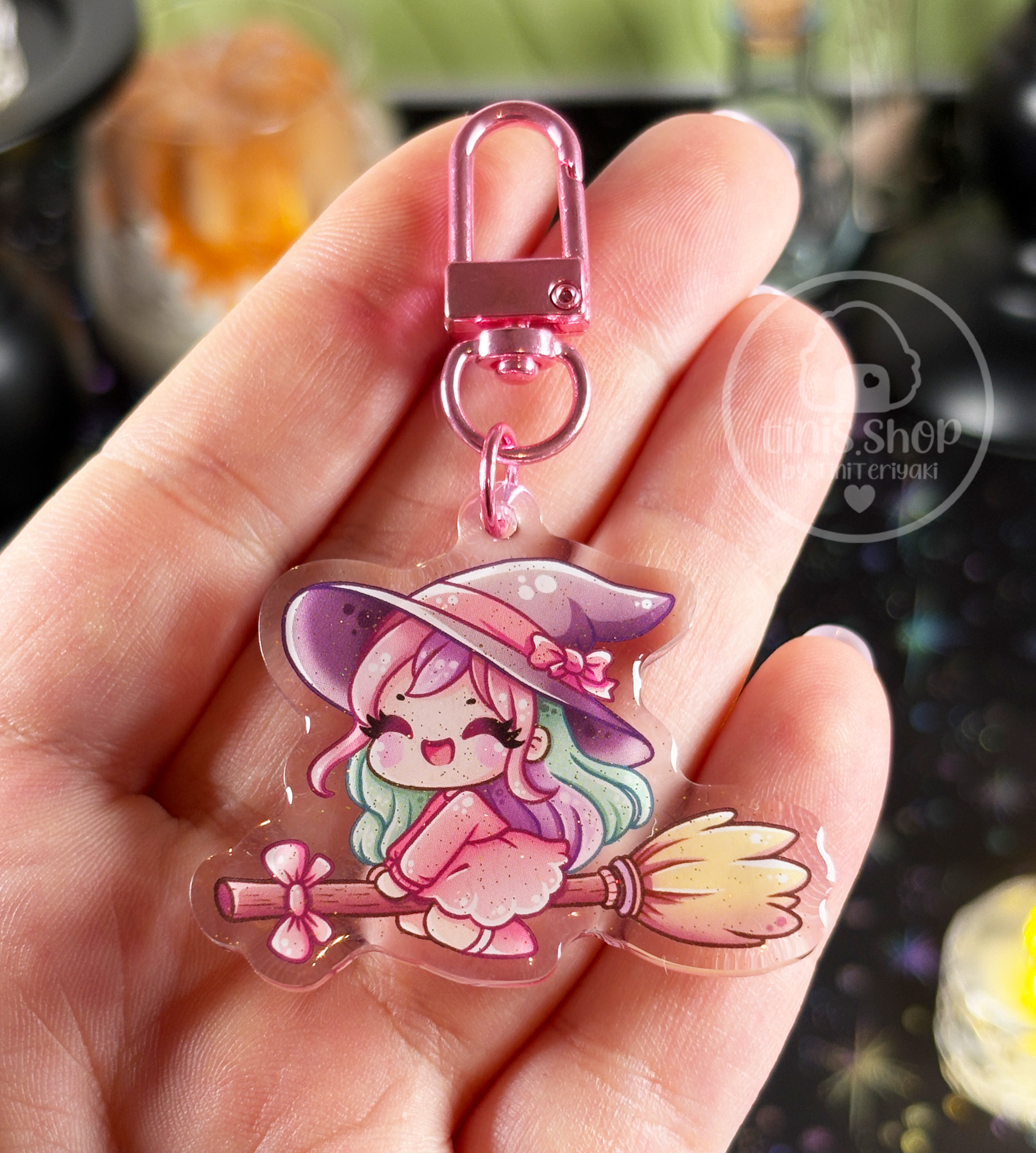 ✦ bedruckter transparenter Schlüsselanhänger mit dem Motiv: "Hexe auf Besen"